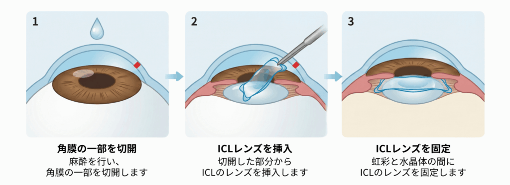 ICLは、目の中に専用のレンズを挿入し、レンズの屈折力によって視力を矯正する治療法です。ICL治療で使用するレンズは生体適合性の高い素材を使用しているため、半永久的に眼内に置いておくことができます。また、角膜を削らず目の中にレンズを入れるため何かあった際に取り出すことができるというのも特徴の1つです。